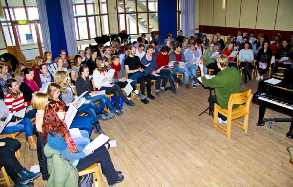 I den stora festsalen två trappor upp står en flygel och ett hundratal stolar i en halvcirkel. Kördeltagarna börjar droppa in. Tolv studentkörer med upp emot 400 deltagare kommer att uppträda på årets festival. Storkören, som ska repetera just nu, är en sammanslagning av alla studentkörer.