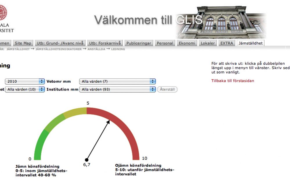 Där kan jämställdhetsindikatorerna vara till stor hjälp. Genom att välja en specifik institution eller fakultet kan man se hur könsfördelningen ser ut inom olika delar av universitetet – både bland anställda, doktorander och studenter. Sammanlagt finns det statistik för tio indikatorer. Förutom att se om något av könen dominerar bland de anställda kan man titta på om det finns skillnader vad gäller sjukskrivningar och föräldraledighet. nbsp;