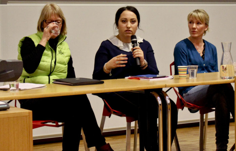 Ett fyrtiotal åhörare tog sig till Blåsenhus den 6 mars för en paneldabatt om stress. Från vänster: Elisabeth Nilsson från Studenthälsan, Alexandra Abde, vice ordförande vid Uppsala studentkår och Maria Björk, fil.dr. i idé- och lärdomshistoria. Med fanns också Eva Söderman från Studentavdelningen.