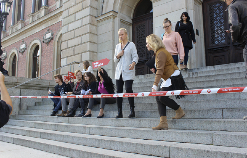 Nya studenter fick stanna upp och kliva över avpärrningsbanden med texten ”Inte till salu” på vägen in och ut ur universitetshuset på tisdagen. Samtidigt delades informationsblad ut och spontana diskussioner uppstod utanför föreläsningssalen.