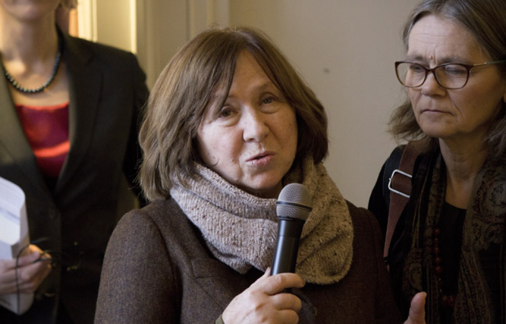Aleksijevitj belönas i år med nobelpriset i litteratur, för ”hennes mångstämmiga verk, ett monument över lidande och mod i vår tid.” Kriget har haft en stor roll i hennes författarskap.