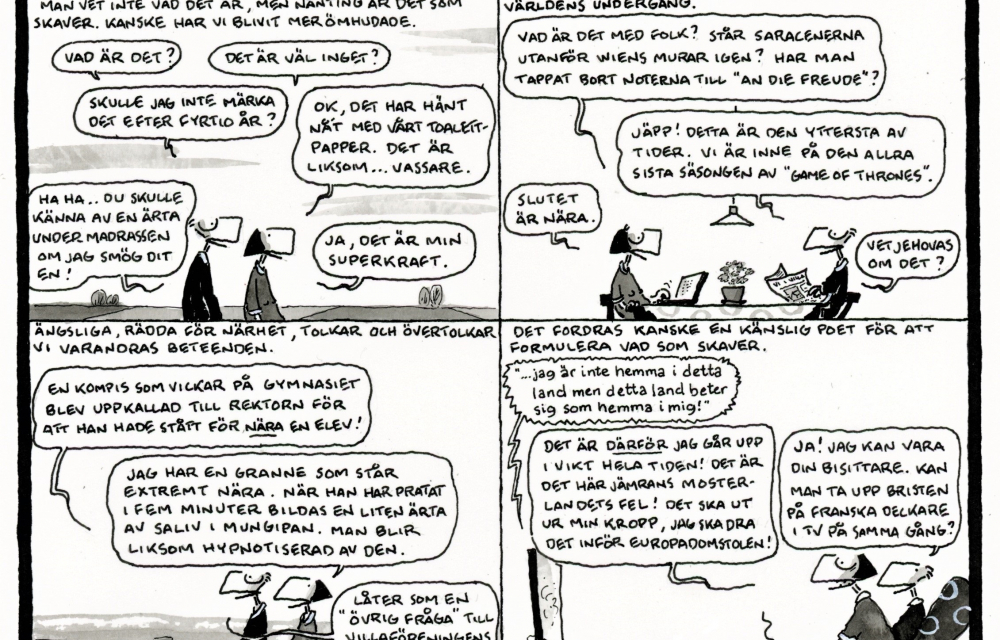 Antikvariat Thomas Andersson på Övre Slottsgatan, mittemot Ergos redaktion, har inte mycket yta att röra sig på – i synnerhet inte i dag när gångarna mellan böckerna är fulla med folk som köar för att få ”Serier från andra våningen” signerade av Jan och Maria Berglin. De båda tecknarna är återkommande besökare i bokhandeln.