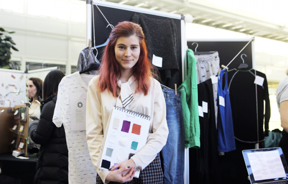 Några stånd bort hänger klädesplagg på galgar. Ellen Widstrand läser också på Cemus och har valt att driva ett projekt om hållbar klädkonsumtion. Hennes grupp har gjort en guide för konsumenter som vill veta hur de ska tänka när de handlar kläder. Bäst är att handla second hand, men om man köper nytt kan man göra stor skillnad genom att välja rätt material.