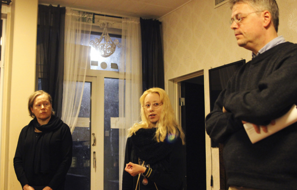 Helena Nordlund, Dianna Zeleskov och Björn Collin manar upprörda hyresgäster till lugn.