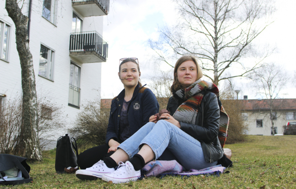Aprilvädret är för tillfället på juridikstudenterna Johanna Eklunds och Sophia Södergårds sida, och de har slagit sig ned i gräset intill ett av de vita femvåningshusen på Rackarberget för att plugga och äta muffins. Ingen av dem bor här, men Johanna Eklund hade ett studentrum här till för ett halvår sedan och tycker mycket om området.