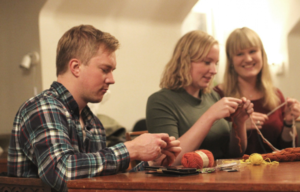 Gården är full av cyklar, som de flesta verkar tillhöra gäster på ölkällaren Djäknen. Men alla som besöker Västgöta nation denna onsdag kväll är inte här för att gå på pub. Jag går upp till Kinnekulle på övervåningen, en mjukt belyst sal som går i grönt och vitt. Runt ett stort brunt bord fullt med garnnystan i olika färger sitter fem personer försjunkna i handarbete och trivsamt småprat.