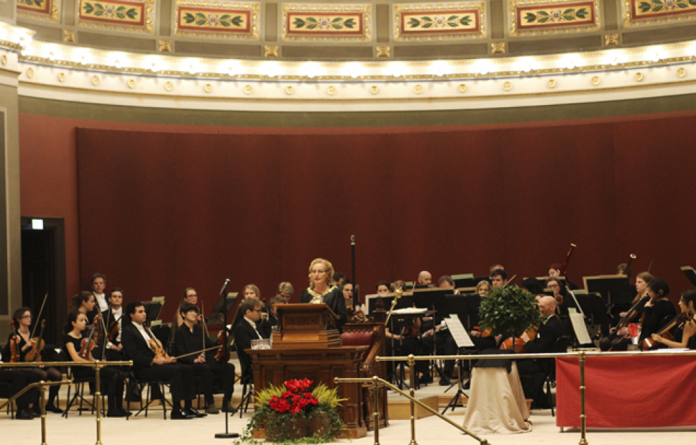 Docent Carl Frängsmyr håller ceremonins högtidsföreläsning, under rubriken ”Från idealistiskt nationalmonument till akademisk arena”. Vi får veta att danske litteraturforskaren, känd som en den liberala tidens man, Georg Brandes när universitetshuset byggdes var föga imponerad, och kallade konstruktionen ”ett kostsamt spel för gallerierna”.