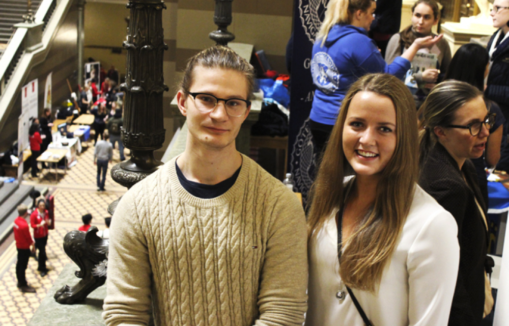 Vi vandrar vidare genom mässhallen, som är full av stånd. Studenthälsan är representerad, liksom kårer, nationer och föreningar. På övre planet står Matilda Kewenter, 20, och Andreas Hydén, 21. Hon kommer från Göteborg och han från Stockholm, de träffades första gången idag.