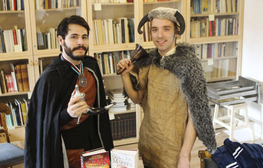 Två gestalter i fårskinnsmantlar kliver in i biblioteket på Gotlands nation. På bordet i mitten har samtliga utgivna delar av George R.R. Martins bokserie ställts upp.