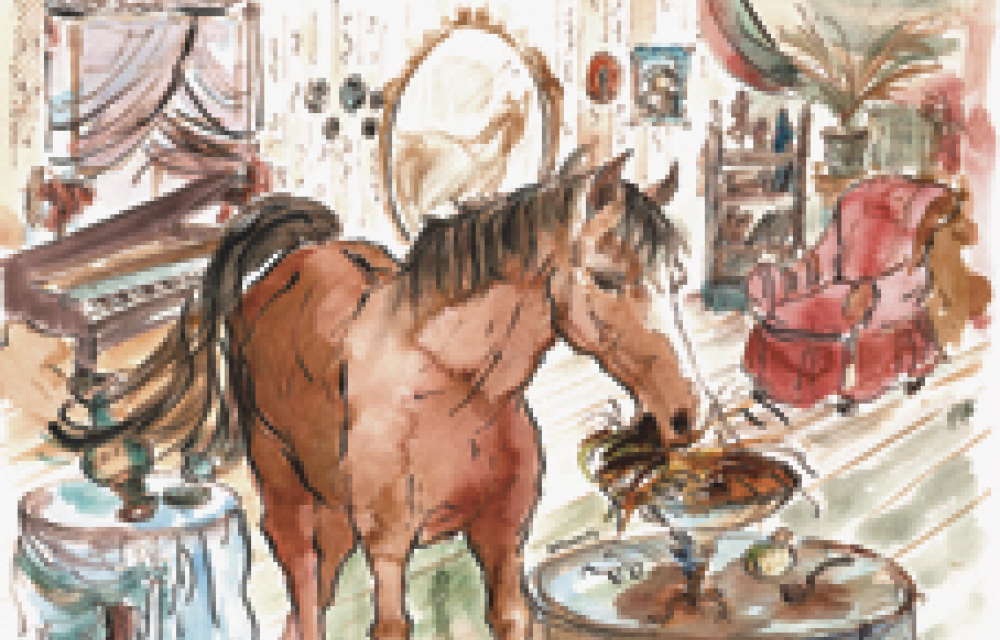 Den stackars hästkraken gick troligen tämligen sällan på middagsbjudning i ett sådant fint hem, så det är möjligt att den brast något i etikett. Likväl tyckte nog hästen att det var en ytterst trevlig bjudning, när den strax därefter lämnades ensam, lyckligt tuggande på skrivbordets innehåll. På det hela taget blev det en minnesvärd och trevlig kväll för hästen. Möjligen skulle kraken, om den någonsin hade ombetts utvärdera kvällen, ha framfört vissa synpunkter och förslag till förbättringar rörande värdskapet. När värden fram på efternatten själv kom hem var han nämligen alls inte lika trevlig som hästen föreställt sig. Tvärtom faktiskt. När chocken lagt sig försökte sprätthöken utan framgång skaka liv i sin hyresvärdinna och hennes piga. Först framåt gryningen, efter en massa buller och trassel, lyckades han äntligen jaga rätt på fyra vakna arbetskarlar, hvilka efter otroligt stretande, krångel och oväsen hjelpt honom att ändtligen bli kvitt den objudne, besvärlige och föga propre gästen.