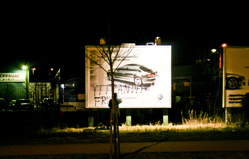 Lukten av sprayfärg sprider sig över parkeringsplatsen i Gränby. Det ackompanjeras av det karakteristiska klickandet av sprayflaskor som skakas. Trots att det är mitt i natten hörs ett dovt billjud i fjärran. Gruppen arbetar under tystnad. Efter cirka tio minuter är alla skyltar – både de lysande, glastäckta, de höga trekantiga och de plankliknande bilreklamerna – på ett eller annat sätt förstörda. nbsp;