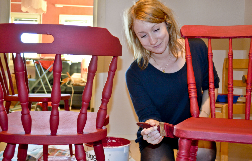 På hallgolvet står intensivt rödrosa stolar och torkar på tidningspapper. Det är andra varvet med färgen, innan var de vita, upplyser Malin Sondell. Intill stolarna finns en stor, vit byrå som väntar på att piffas upp med nya handtag. Den svagt ljusblå färgen på en liten pall har precis hunnit torka – ovanpå har Cecilia Anttila limmat fast en duk i snirkligt mönster. Som en stoldyna.