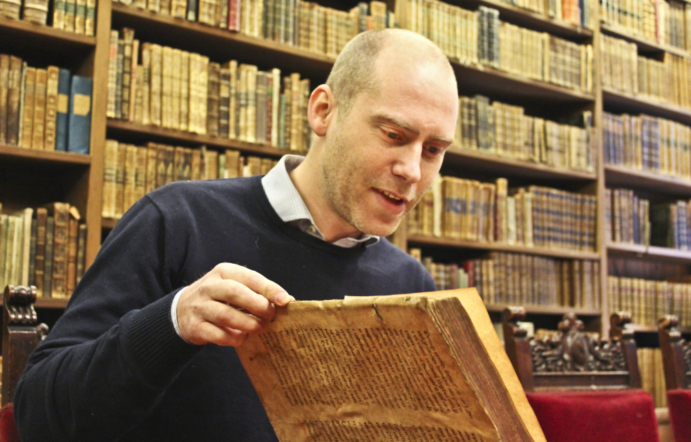 ”Sämre arbetsplats kan man ju ha”, konstaterar Carl Ehrenkrona och lägger handen på ett gammalt uppslagsverk från sent 1500-tal.