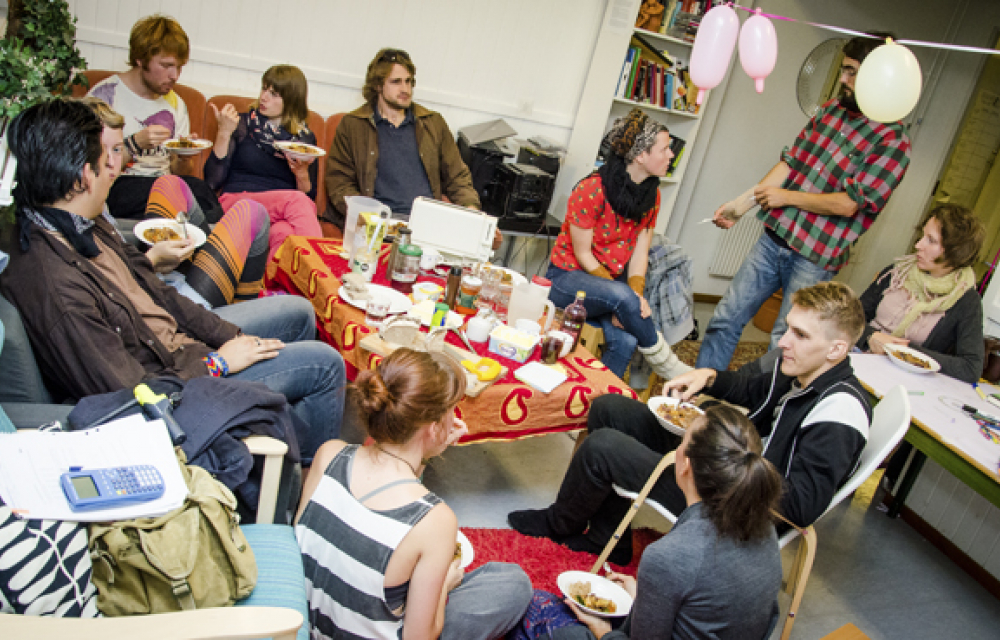 Den 7 september – kvällssolen lyser svagt in i fönstret. Det luktar mat, någonting med curry och vitlök. Per Tjäder tar fram tallrikar och ställer kastrullerna på bordet. Han och två andra Flogstabor har lagat grönsaksgryta med bulgur. Det är en vanlig söndagskväll i det nyöppnade community centret i studentkvarteret Hamberg, mer känt som Flogsta låghus. Yogagruppen har precis blivit klara med sitt pass. De blir bjudna på middag, några stannar och sätter sig i sofforna i det stora köket.