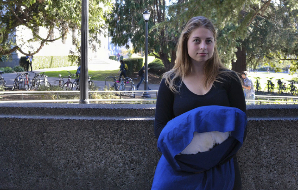 Sofie Karasek är Berkeley-student och har drivit på för Kaliforniens nya samtyckeslag. Hon håller i en kudde – en referens till liknande studentprotester vid Columbia university, där en student beslutat att bära runt på en madrass tills det att studenten som våldtog henne stängs av.