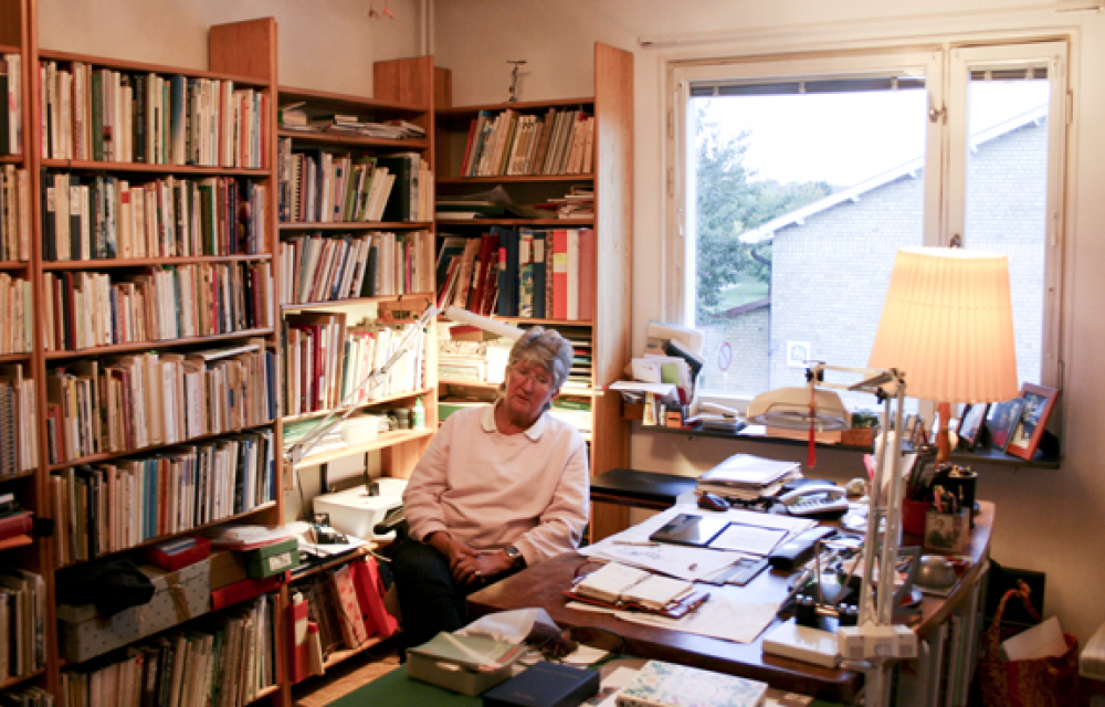 I sitt hemmabibliotek i Tuna backar sitter den pensionerade skolrektorn Gunilla Lindell. Vid fötterna ligger taxen Einstein som ibland far upp och skäller ut störande ljud i trappuppgången.