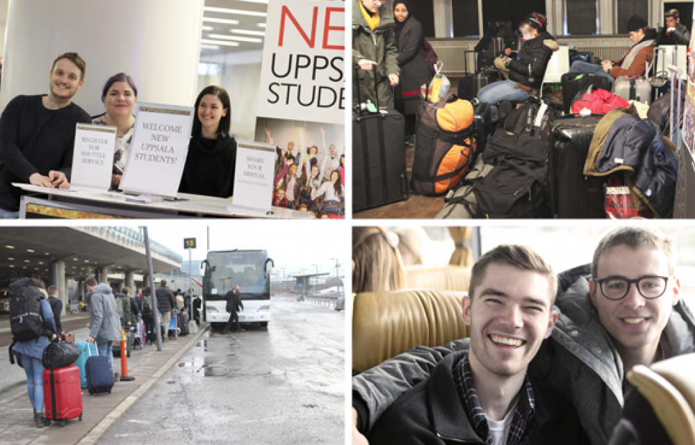Från vänster: Jonathan Schalk, Lina Solander och Hannah Maxwell från universitetets internationella kansli välkomnar vårens internationella studenter till Uppsala och Sverige; bagage och trötta nyanlända studenter på ÖGs internationella mottagning; kö till bussen som ska ta de nya studenterna till Uppsala; Jack Gorman och Jorn School från USA respektive Nederländerna.
