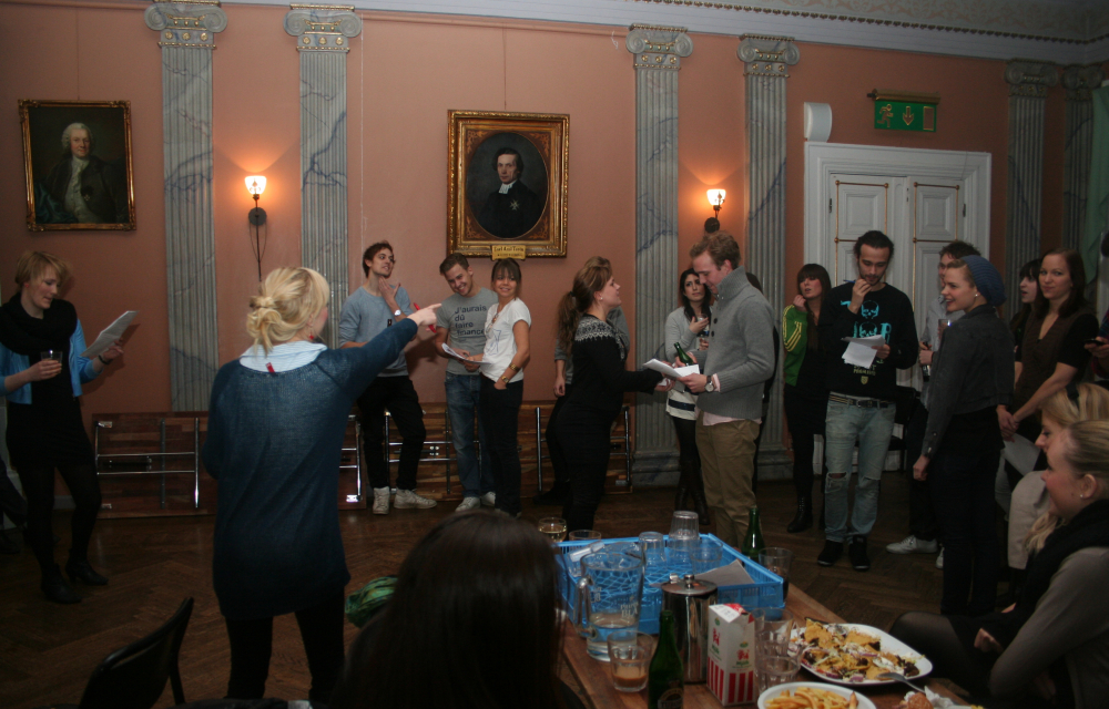 Skådespelarna börjar fylla salen på Stockholms nation. Ikväll ska den stora ensemblen repetera en masscen. Huvudpersonen Lennart har vunnit en låtskrivartävling och nu är det släppfest.