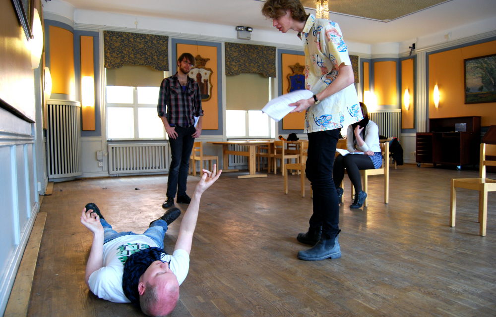 Repetitionerna pågår för fullt. Idag ligger fokus på övergångarna mellan olika scener. Regissören och teaterförmannen Maria Carlsson sitter på en stol mitt i rummet och ropar ut instruktioner till skådespelarna framme på ”scenen”. Ibland sufflerar hon. Arbetet med pjäsen har pågått sedan i januari med repetitioner en gång i veckan, men nu på sluttampen träffas teatergruppen nästan varje dag.