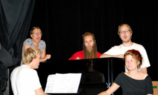 Sedan vänder han sig om mot skådespelarna Charlotte Törner Bergius, Anna-Karin Blomster och Jennie Olsson som med övertygande inlevelse drar igång scenen. ”Skitbra, kör igen ” säger Kristian Elmeskog efteråt och ger några instruktioner till skådespelarna, som vid det här laget kan sina repliker så gott som utantill. När scenen sitter är det dags för Jennie att öva på en sång som hon i själva föreställningen ska framföra med ett kompband. Kapellmästare Nisse Blomster, som står för musiken i spexet, börjar spela på sin gitarr och Jennies röst tar snart över salen. nbsp;