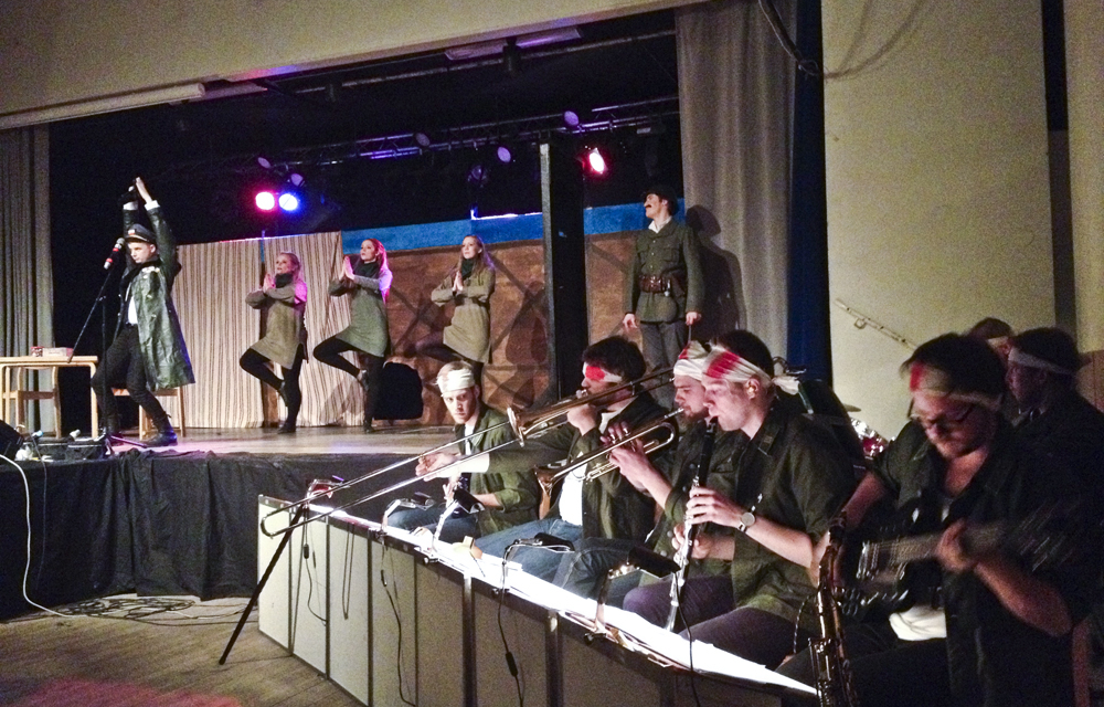 En kul tillställning som hänger på att publiken bidrar till stämningen , skriver Ergos recensent om V-Dalas storspex – Grabben i skyttegraven bredvid.