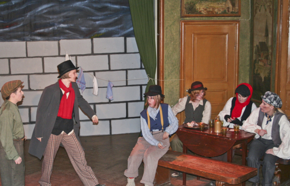 Efter en stark inledningsscen där Olivers mamma skriker i förlossningssmärtor, har publikens intresse och fulla uppmärksamhet genast fångats. Hela första akten är medryckande, skämten kommer ofta och de allvarliga scenerna ger starka obehagskänslor. Det märks att det är olika åldrar och erfarenhetsgrad bland skådespelarna, men gemensamt har de tydlig scennärvaro. Karaktärerna porträtteras på ett trovärdigt sätt, mycket tack vare sminket och de tidstypiska kläderna.