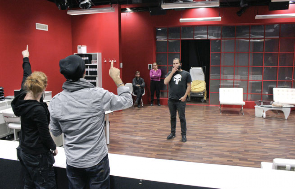 Scenen töms och Rikard Lekander, pjäsens regissör ropar kör. Vita plastmuggar sprutar plötsligt ut från en dryckesautomat.