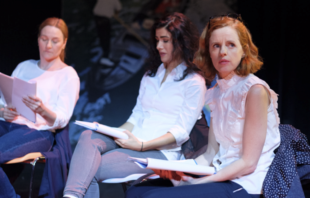 Annika Hallin, Angelica Radvolt och Malin Alm utgör en del av ensemblen i komedin Verklighetens folk som just nu spelas på Uppsala stadsteater.