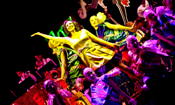 En rolig historia, som visas 10-20 maj på Uppsala Stadsteater, är ett ambitiöst företag i två akter. Likså ljud, ljus och kostym – med egen orkester och otaliga klädbyten för den stora ensemblen är jag faktiskt smått förbluffad över hur smidigt allting går. Föreställningen är välrepeterad och publiken tas med på en resa från istiden (med tillhörande fuskpäls) fram till nutiden – och därtill en filosofisk och gullig inblick i framtiden. Nostalgi blandas med, för det mesta, intelligent invävd samhällssatir genom korta besök i väl valda delar av vår västerländska historia. Juvenalorden skapar genom föreställningen ett eget ekosystem, ett universum om en så vill, som lämpligt nog inleds med en rymdscen vars kosmiska ljus draperar hela salongen.