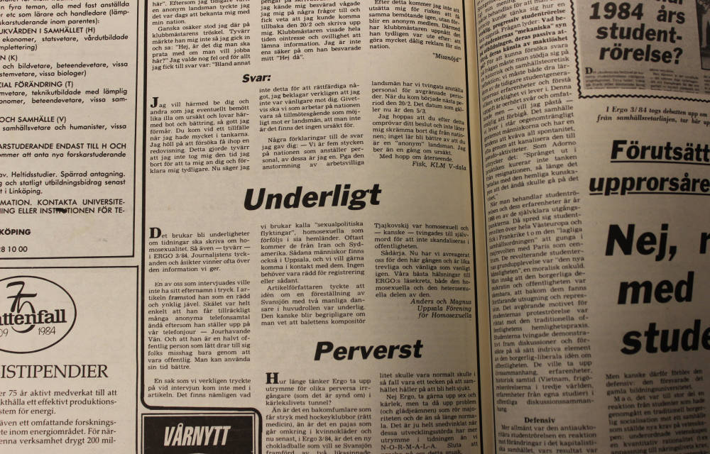 Artikeln blir startskottet för flera inlägg på insändarplats i Ergo under 1984. Den första har rubriken Perverst och är så fylld av skällsord och hat att det är svårt att förstå att den gick i tryck. Nej, Ergo, ta gärna upp sex och kärlek, men ta då upp problem (och glädjeämnen) som rör majoriteten och de än så länge normala. nbsp;