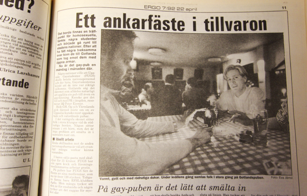 ”Ett ankarfäste i tillvaron” är reportagets rubrik och man anar att det då, för 25 år sedan, var ännu mer värdefullt än i dag att som person med normbrytande sexualitet få ett sammanhang där man kunde vara sig själv. De besökare på puben som intervjuas beskriver ett studentliv där heteronormen verkar näst intill ogenomtränglig. Homosexualitet var sedan länge avkriminaliserat och sågs heller inte som en sjukdom enligt Socialstyrelsen 1992, men gaypubens besökare tycks i regel inte vara öppna med sin läggning på universitetet. En tjej som heter Annika tror att studentvärlden är svårare att komma ut i eftersom den känns sluten, och berättar att hon i flera år delade korridor med en bög utan att veta om det. En kille som läser teologi tänker hoppa av sin utbildning för att han inte är beredd att ta de konflikter som uppstår när man som präst vill leva med en man.